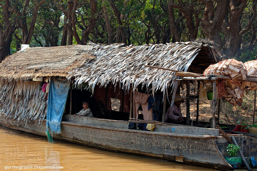 Tonle Sap River - a river which changes its direction of flow. Tonle Sap has its origins in the same lake and flows into the Mekong, the largest and most powerful river in Indochina. On reaching the dock and I rented a boat and went to her in a way against the flow towards the lake to the village.